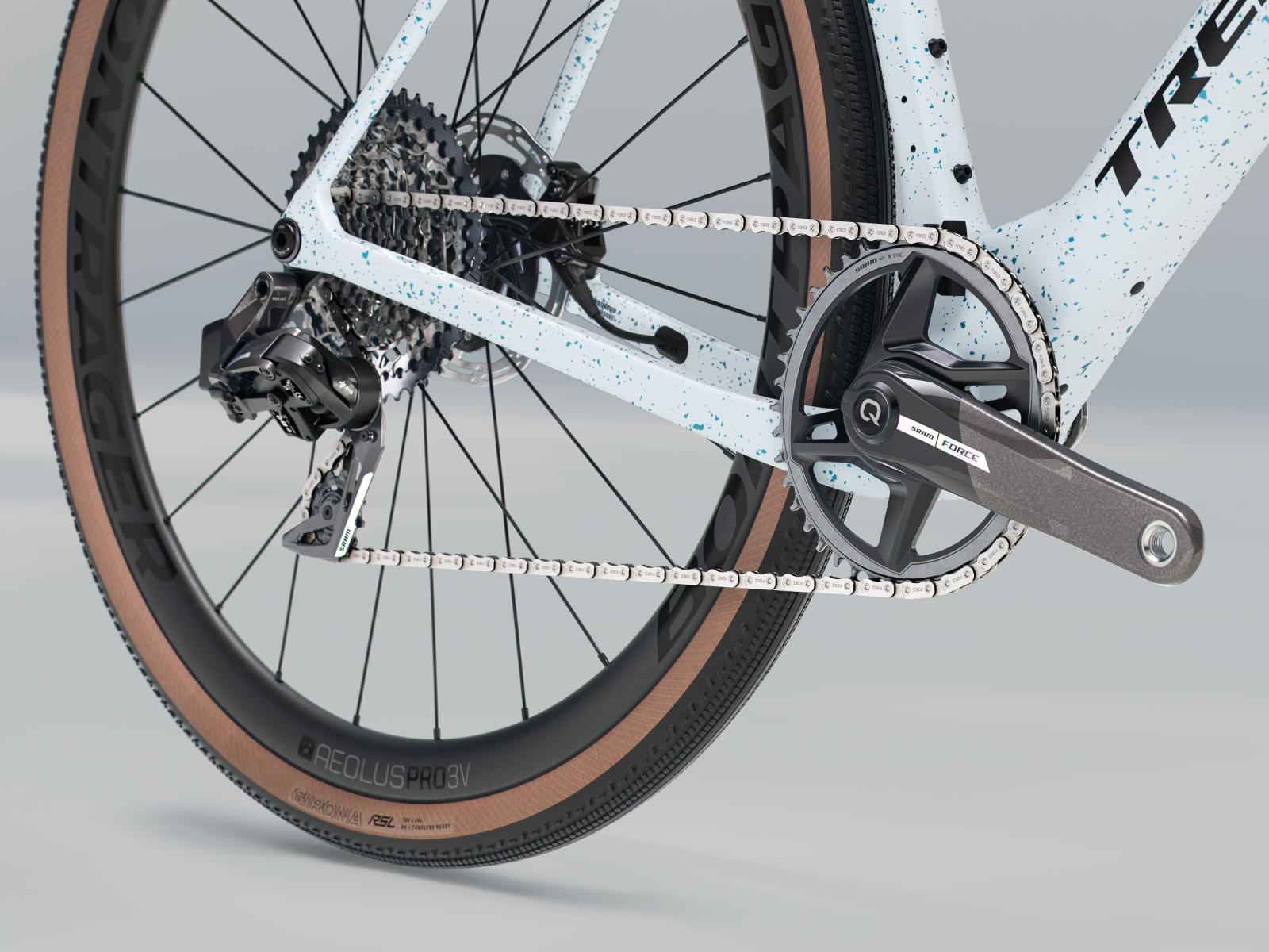 Einen leichten und aerodynamischen Rahmen aus 800 Series OCLV Carbon mit IsoSpeed-Komforttechnologie und vielen Befestigungspunkten für die wichtigsten Utensilien des Renntages. Bontrager Aeolus Pro 3V Carbonlaufräder und eine Trek Aero RSL Lenker-Vorbau-Einheit aus Carbon für ein leichtgewichtiges und agiles Fahrverhalten. Außerdem SRAMs Force XPLR AXS D2 Antrieb mit kabelloser Schaltung für ruppige Straßen.