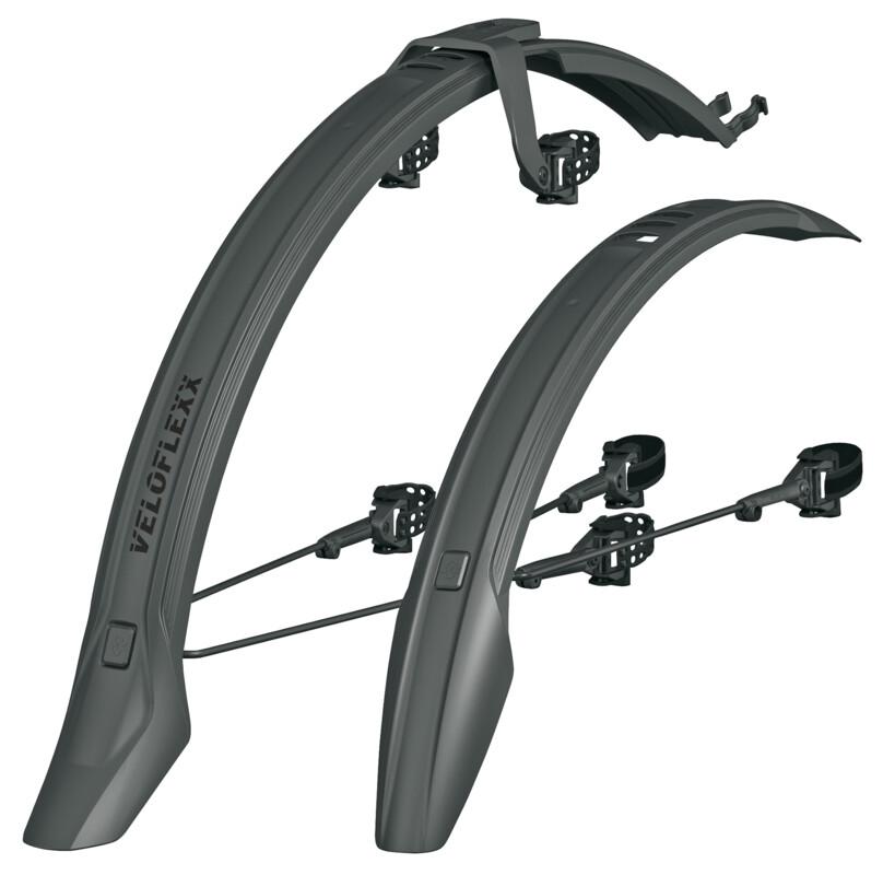 Nachwuchs in der Velo-Familie: Das Radschutz-Set VELOFLEXX 55 aus schlagfestem Hochleistungskunststoff vereint die Stabilität eines festmontierten Schutzbleches mit der Flexibilität eines Steckradschutzes. Durch die VELOFLEXX-Brücke lässt sich der Hinterradschutz anhand von Gummistraps oben an der Sitzstrebe werkzeugfrei befestigen. Sollte trotz Scheibenbremsen ein Quersteg zwischen den Sitzstreben vorhanden sein, muss der Abstand zwischen Reifen und Quersteg 30 mm betragen, damit das Fahrrad mit dem VELOFLEXX Radschutz kompatibel ist. Vorne wird das VELOFLEXX an der Gabelbrücke mit einem gummierten Klettstrap oder Kabelbinder befestigt. Die Rahmenadapter machen die Montage an jeder Gabel möglich und sind zudem winkelverstellbar. Für noch mehr Halt sorgen die schwarz beschichteten Streben. Das VELOFLEXX-Set ist für Fitnessbikes, Mountainbikes und City Bikes geeignet. Klettstraps und Gummistraps sind im Lieferumfang enthalten.