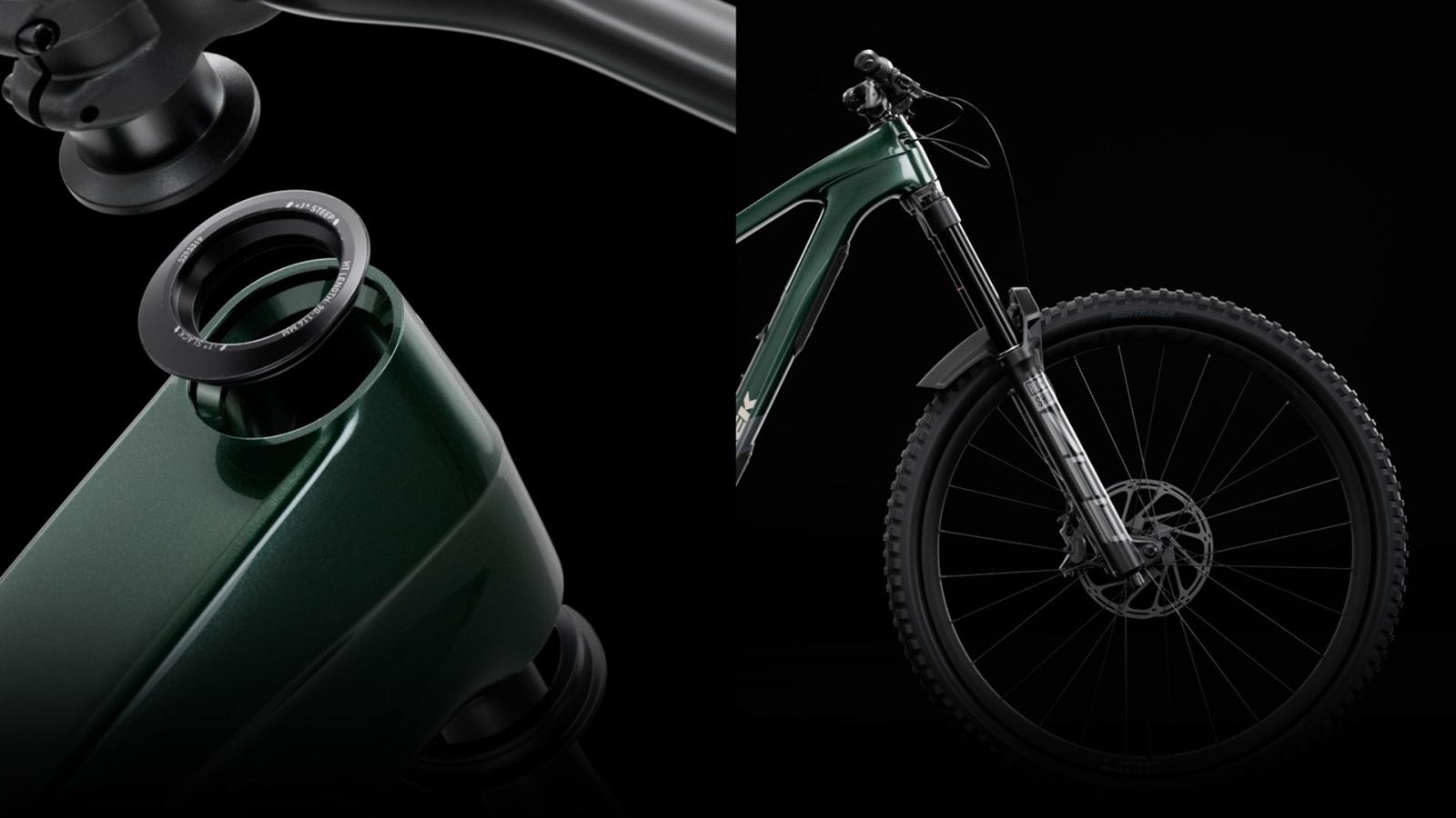 Einen Rahmen aus Alpha Platinum Aluminium mit High-Pivot-Fahrwerk und Umlenkrolle, plus Rahmenstaufach. Außerdem eine FOX Rhythm 36 Federgabel mit 170 mm Federweg, Float EVOL Luftfederung und GRIP-Dämpfung sowie einen FOX Performance Float X Dämpfer mit ebenfalls 170 mm Hub. Außerdem Shimanos XT Antrieb mit breiter Übersetzung für knackige Anstiege, eine Bontrager Line Variosattelstütze und eine Mullet-Laufradkonfiguration mit Bontrager Line Comp 30 Tubeless Ready 29er Vorderrad und 27,5 Zoll Hinterrad, inklusive Rapid Drive Nabe.